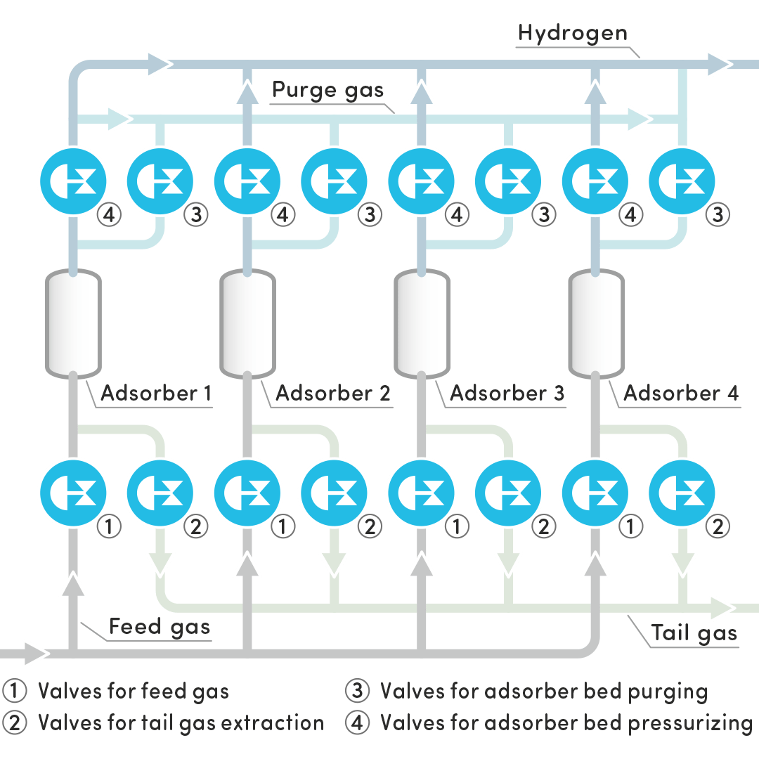 ARCA supplies efficient control technology for the pressure swing adsorption process, or PSA for short, where hydrogen is reclaimed from raw gas. Degrees of purity of up to 99.9999% are possible. The process is characterized by frequent actuating cycles of the control valves, as the gas is passed from one absorber to the next and returned. A tight closure of the control valves in both flow directions is crucial for the purity of the gas. The patented ARCA soft seal has impressively proven its reliability with more than 1 million operating cycles.